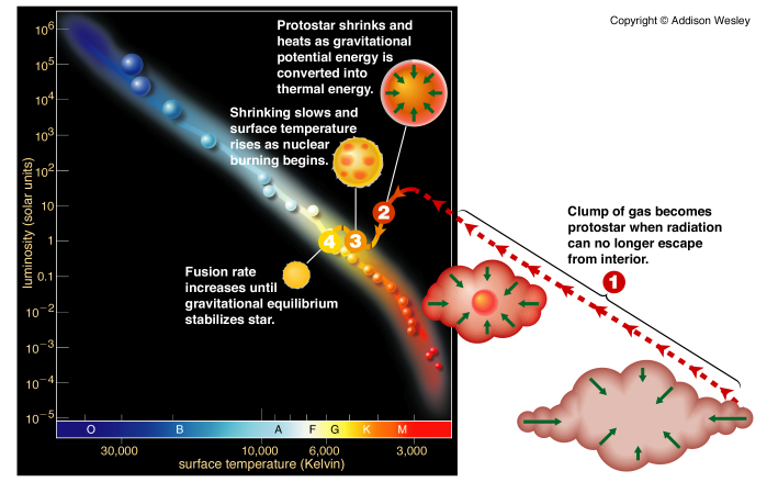 Over the span of millions of years, the gas in the protoplanetary disk dissipates -- perhaps captured by planets -- and the star reaches the main sequence. In other words, pressures and temperatures inside the star become high enough that fusion can occur.