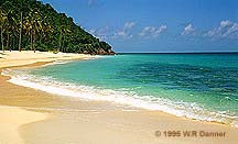 Beach (left) along coast of Antigua, Caribbean Sea. Sediment (right) is composed of shelly debris.