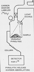 "Of the three Viking biology experiments, only the PR experiment approximated actual martian surface conditions and did not use water. In this experiment, a 0.25-cc soil sample was incubated in a simulated martian atmosphere of CO2 and CO labeled with carbon-14. A xenon arc lamp provided simulated sunlight. After 5 days, the atmosphere was flushed and the sample heated to 625 degrees C (1157F) to break down, or pyrolyze , any organic material, and the resulting gases were passed through a carbon-14 detector to see if any organisms had ingested the labeled atmosphere."